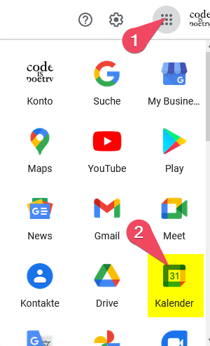 (1) Melden Sie sich bei ihrem Google Account an und (2) wählen Sie die Anwendung "Kalender":