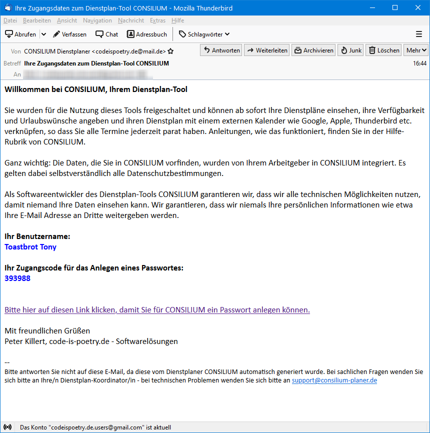 Der betroffene Mitarbeiter erhält dann folgende E-Mail von CONSILIUM und kann sich, bei Bestätigung der Nutzungsbedingungen, selbst in CONSILIUM anmelden.